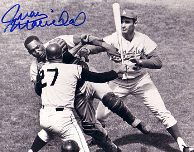 “On August 22, 1965, Marichal faced Sandy Koufax at Candlestick Park in the heat of a tight pennant race. The Giants and Dodgers had come close to a brawl two days earlier over catcher’s interference calls. Los Angeles’s Maury Wills had allegedly tipped Tom Haller’s mitt with his bat on purpose, and Marichal’s best friend, Matty Alou, retaliated by tipping John Roseboro’s face mask. Roseboro nearly beaned Alou with his return throw to the mound. In the August 22 game, Marichal had flattened Wills and Ron Fairly with pitches when Roseboro purportedly asked Koufax to hit Marichal. When Koufax refused, Roseboro’s return throw came close to Marichal’s head. Name-calling ensued, until Roseboro suddenly ripped off his mask and stood up. Marichal rapped the catcher on the head with his bat. What followed was one of the most violent brawls in major league history. Willie Mays led away Roseboro, who had suffered a concussion, while Dodger Bob Miller tackled Marichal, Alou slugged Miller, and Tito Fuentes menaced the Dodgers with his bat. Roseboro sued Marichal, but eventually dropped the suit. Marichal was fined $1750, was suspended for a week, and missed two starts as the Giants finished two games behind the Dodgers. Years later, Marichal said, “I feel sorry that I used the bat.”