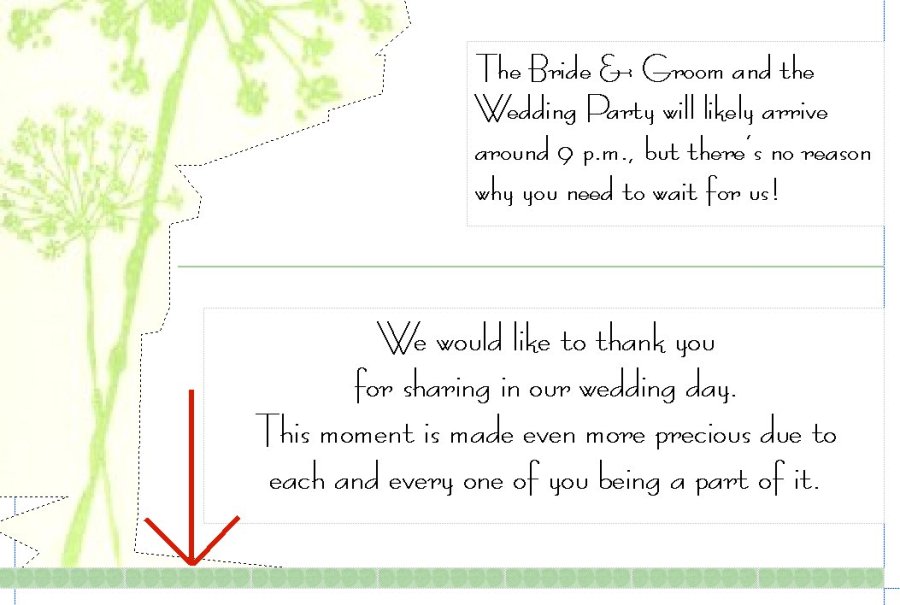 This meant hiding a picture somewhere. I made the decision that given a common theme of all these printed wedding materials was a floral pattern, I decided I would create a border pattern disguised to be floral in nature. Pay attention to the green, patterned band at the bottom.
