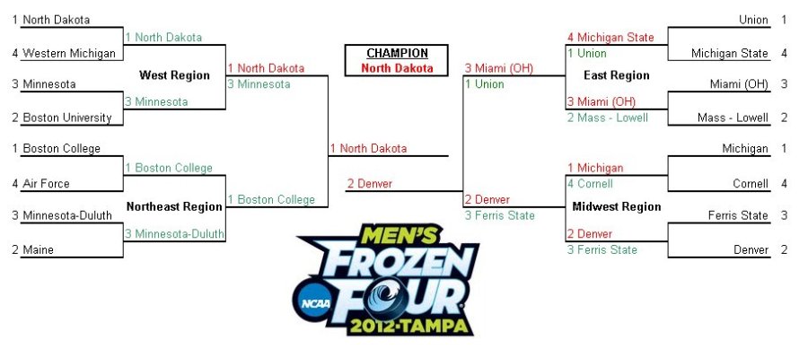 As the Red/Green show above tells you, I gagged on three of the Frozen Four and have no shot at hitting the winner. The damn WCHA screwed me once again as out of the four teams the conference placed in the tournament, only the Minnesota Golden Gophers advanced to the Frozen Four. At least this is the last year that I need to worry about the WCHA as a factor in this tournament with the tectonic re-alignment that is coming to the college hockey world.