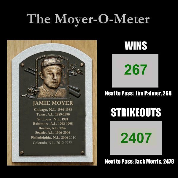 Despite that, Moyer still cemented his place in history.   At 49 years and 140 days when the Colorado Rockies’ season began Friday, Moyer is the oldest starting pitcher to make an opening-day roster.  Saturday, Moyer made a bid to surpass Phil Niekro as the oldest starting pitcher at 48 years, 110 days on July 20, 1987  to win a game. For the record, Moyer’s next win would make him the oldest pitcher overall to win a regular season game, eclipsing the record set by reliever Jack Quinn who notched a win at 49 years, 74 days, on Sept. 13, 1932.