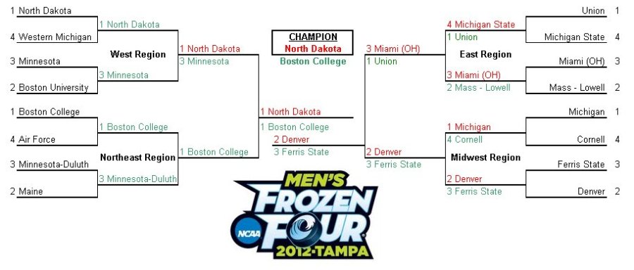 As the Red/Green show above tells you, I gagged on three of the Frozen Four and have no shot at hitting the winner. The damn WCHA screwed me once again as out of the four teams the conference placed in the tournament, only the Minnesota Golden Gophers advanced to the Frozen Four. At least this is the last year that I need to worry about the WCHA as a factor in this tournament with the tectonic re-alignment that is coming to the college hockey world.