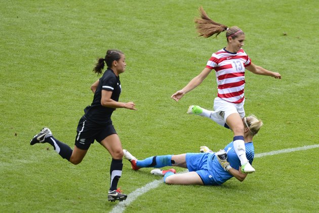 You may be sensing a theme here. Not only did Alex Morgan score the gold-medal winning goal, she also took out New Zealand’s goalie in a preliminary match.