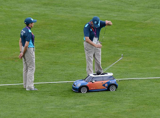 They did this on an outdoor field in Britain. Did nobody tell them it rains every goddamn day there? Every time somebody hit the ball, it left a rooster-tail of water behind it. They either needed a roof or a squeegee?