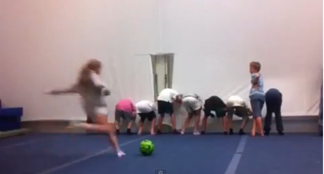 First of all, where does one find a school that would line up 9 boys heads down and their pre-pubescent taints exposed for prime soccer-ball damage? Not one of them seems to know what is coming; otherwise you might think they might put a hand or two over their little giblets.