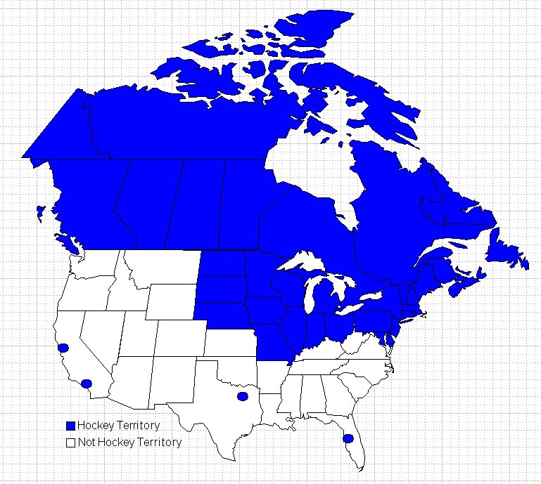 What exactly is “hockey territory?’ Essentially, it anywhere that has a) real winters, b) a reasonable market for professional sports, c) anyplace where hockey is the “national sport,” and/or c) a city with a large population transplanted from “a” or “c.”  In other words, this means Canada, the northeastern third of the U.S., and about four cities outside of that.