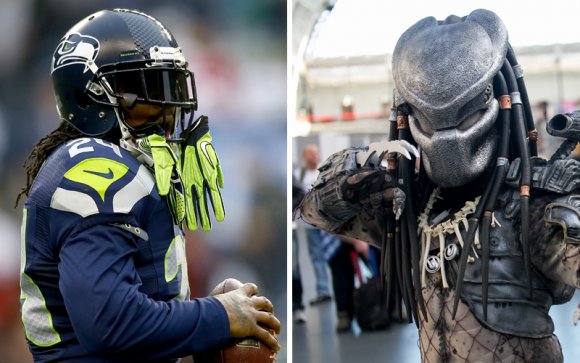 More importantly, as part of Dubsism’s Super Bowl coverage this week, I pointed out that Marshawn Lynch looked a cross between that kid with Skittles for teeth and “Jaws” from the James Bond movies. But I would be remiss if I didn’t point out that Lynch is reminiscent of another movie monster…the Predator.
