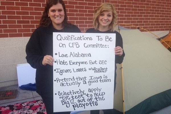 While I can appreciate the sentiment of calling out the frauds at the CFB Play-Off, there’s a massive load of Alanis Morrisette-style irony in this observation coming from what I must assume are fans of the Big 12. Let’s break this sign down: