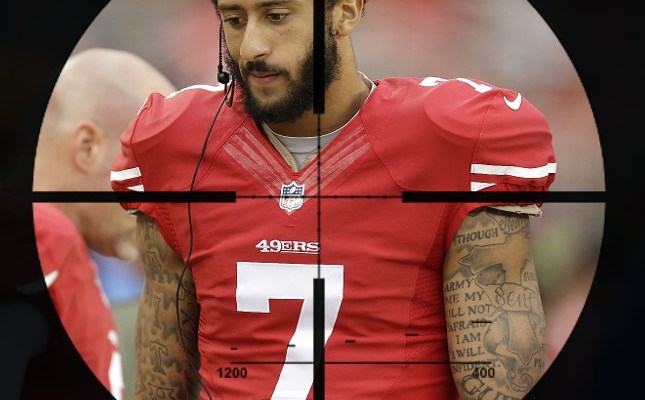 Now, this is the part where you and Dennis call “bullshit” because the 49ers just named Kaepernick as the starting quarterback. This is the part where you say that screws up my theory. It’s exactly the opposite. It works like this. Getting him on the field is Plan B. Am I the only one who sees the setup here? Walk through it with me. If you can’t get the guy off your hands with his “take a knee” crap, why not get him hurt on the field?