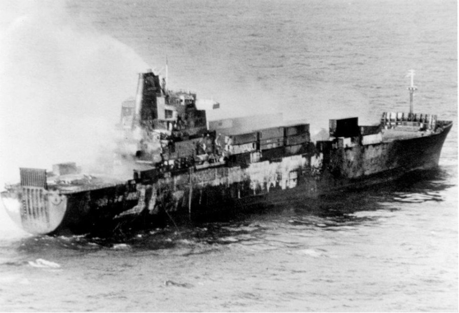 It was for all these reasons that American naval intelligence considered a successful British ejection of the Argentinians from the Falklands to be a military impossibility. Despite all that, the Royal Navy entered the channel between East and West Falkland and commenced landing troops at Port San Carlos on the northern end of East Falkland on May 21st. However, the Argentine air force exacted a serious toll when four days later they slammed an air-launched Exocet into the container ship SS Atlantic Conveyor. The initial blast so badly damaged the ship it’s cargo could not be unloaded; it sank four days later while being towed.