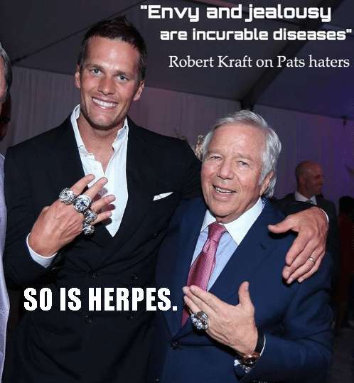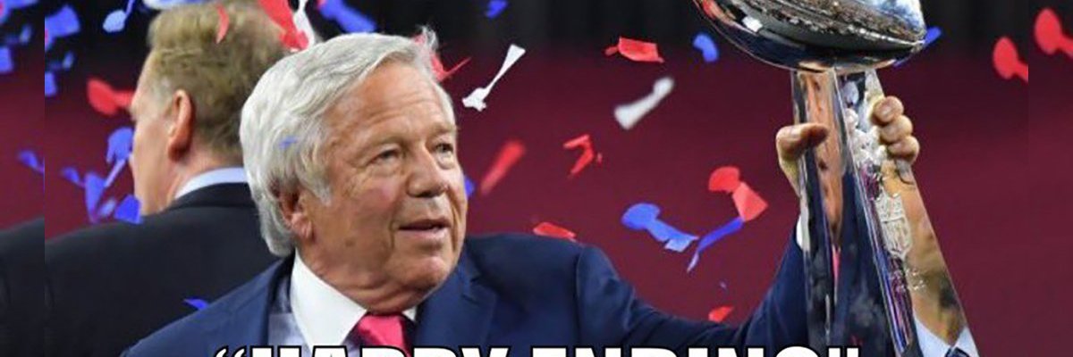 When the story first broke about New England Patriots’ owner Robert Kraft being charged with solicitation of prostitution, originally I had a split reaction. Part of me thought, “Holy shit, the interwebz are going to blow-up with the predictable jokes.  As a sports blogger I am required by federal statue to at least dip my toe into that water, hence the headlining meme.