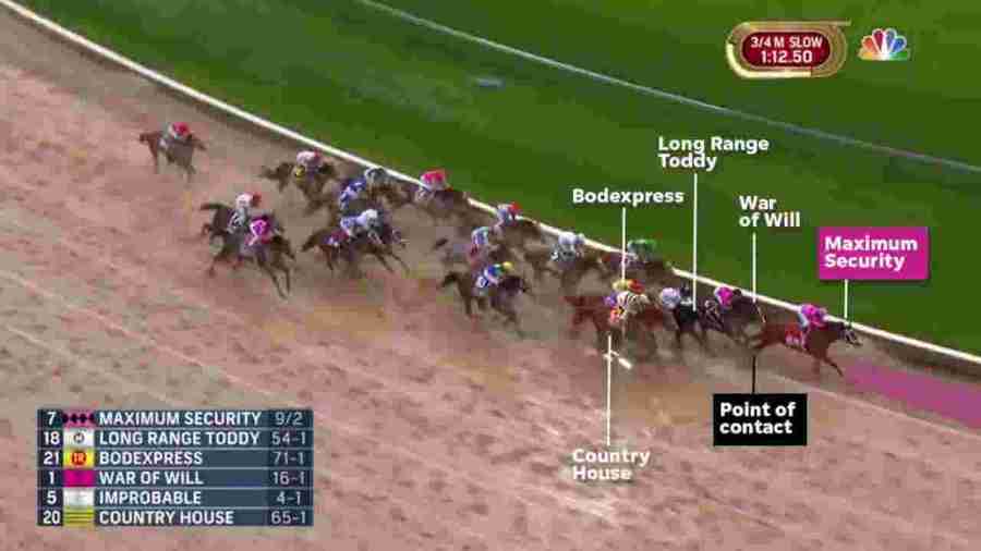 Maximum Security led for the majority of the race, but on video replay, the stewards ruled Maximum Security violated the interference rule by swinging to the right and altering the paths of War of Will, Long Range Toddy, and Country House. The rule as written calls for disqualification if “a leading horse or any other horse in a race swerves or is ridden to either side so as to interfere with, intimidate, or impede any other horse or jockey.” After the review, the stewards determined that Maximum Security interfered with the path of several horses as the field of 19 rounded the final turn, thus the race was awarded to second-place finisher Country House.