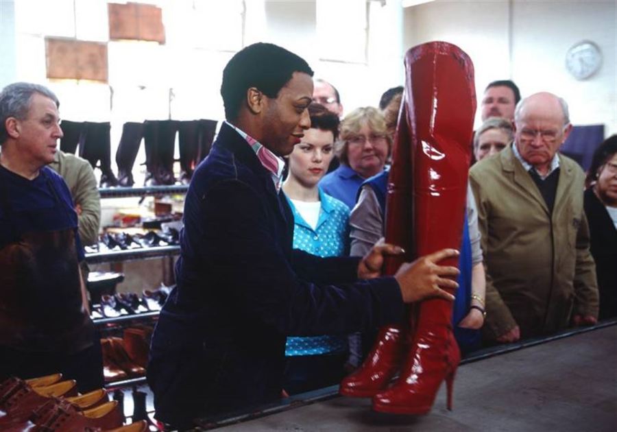 While on a business trip to London to sell the company’s extra stock, Charlie encounters a woman being harassed by drunken hoodlums and comes to her defense. Charlie gets knocked unconscious and wakes up in the backstage dressing room of drag queen named Lola (played by Chiwetel Ejiofor). Being a shoemaker, Charlie is intrigued to find the low level of quality in the shoes worn by the drag queens. He find the heels snap off easily, and that they need to be made in a greater range of sizes…women’s shoes made in men’s sizes.