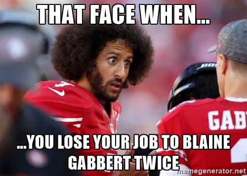 Total bullshit. First of all, you could have signed him; there’s nobody who thought then Kaepernick was still a starting quarterback in this league. This is a guy who lost his job to Blaine Fucking Gabbert TWICE! Look at that through the prism of the present; Kaepernick was seen as the lesser option to a guy who could only get another starting gig after the complete implosion of Marcus Mariota in Tennessee.
