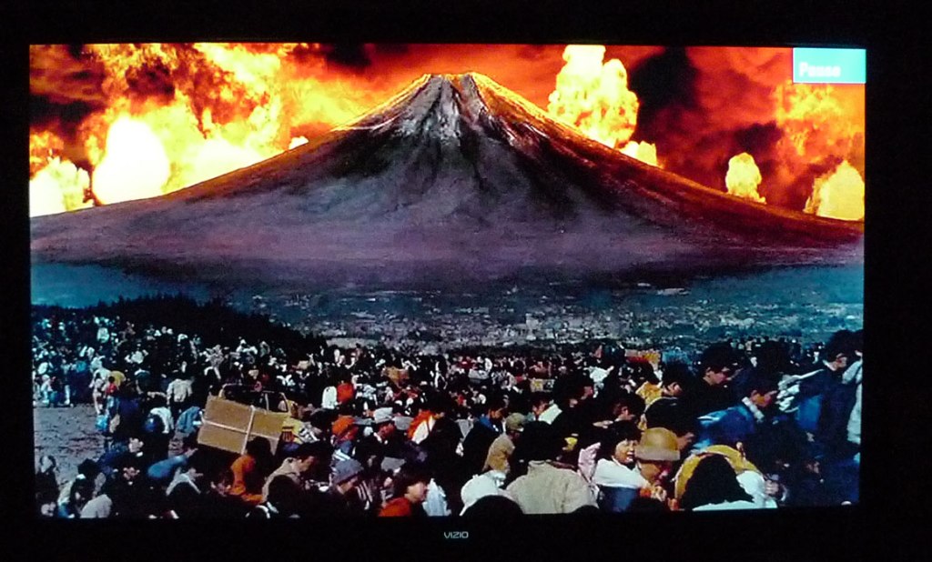 Mount Fuji In Red is all about a nuclear power plant near the iconic Japanese volcano which is having a “melt down.” Crimson clouds or radiation fill the sky causing a mass exodus away from the plant. Out of this human tsunami, two men, a woman, and her two small children appear alone at the edge of the sea. The older man declares to the younger man that all the other humans have done a lemming-like march into the sea to escape the oncoming billows of radiation.