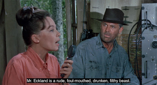 The comedic peak comes when Catherine is foraging for berries with one of the girls when she slips off a log and into some shallow water. She exclaims that something has bitten her, and they both misidentify a partially-submerged tree branch as a snake. Upon returning to the hut, Catherine tells Walter what has happened, In turn Walter contacts Frank, who tells him there are three species of snake native to Matalava, and they are all lethal. Since nothing can be done, Frank advises Walter to keep Catherine “comfortable” until “the end comes.”