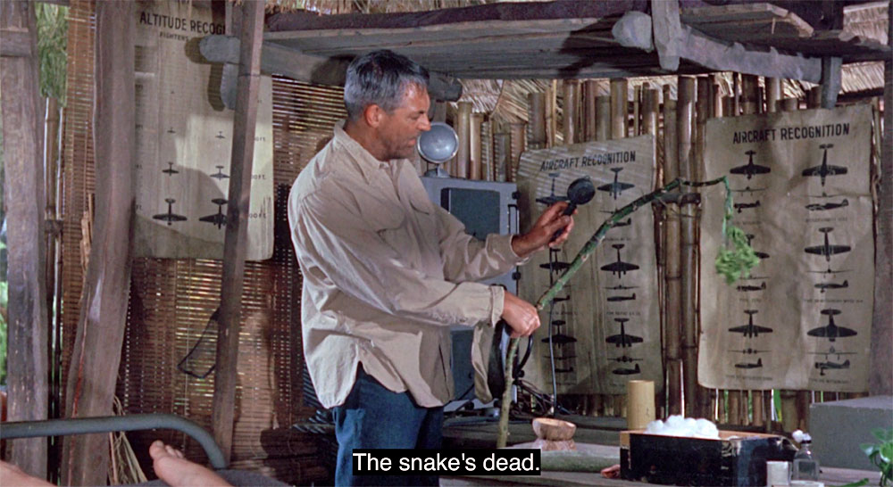 The next morning everything comes to a head. A hung-over Catherine confronts Walter about things she confided in him, he does the same to her…after all of which they finally realize they have fallen in love. But before we can all live happily ever after, those pesky Japanese return. This time however, it’s not in the form of a small landing party. Now, there’s a Zero strafing the hut with machine gun fire and a landing party looking for more than just turtles.