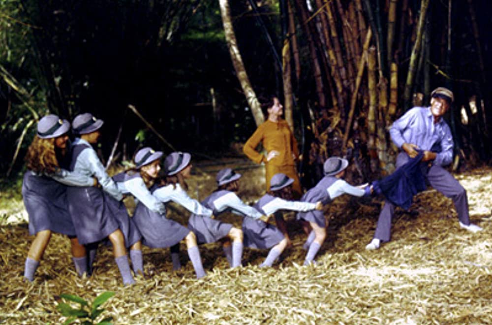 The real problem comes when Frank reaches Bundy Island only to discover that not only has Perry been killed, he was sheltering French school headmistress Catherine Frenau (played by Leslie Caron) and seven school girls in her charge. Walter only has his small seven-foot launch to transport all of them since Frank disabled his main vessel in order to keep him on Matalava.