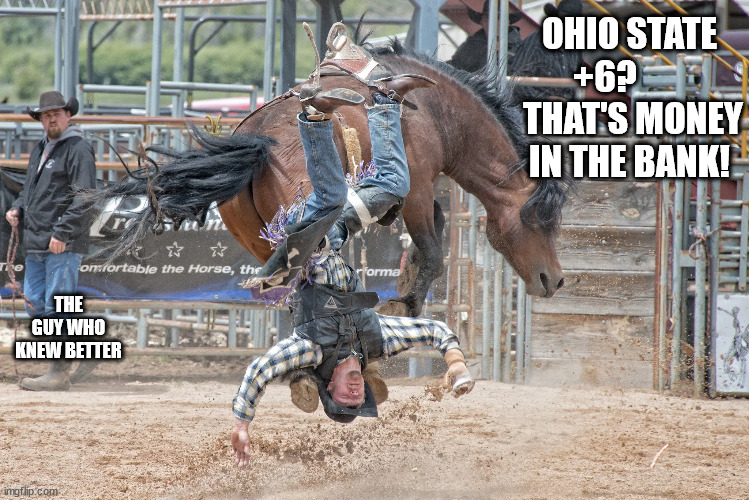 2021 saw the bankroll break a two-season winning streak, largely due a final week where I gave back the entire year’s profits. Yeah, I’m the one who placed the bet, but fuck Ohio State. They couldn’t be bothered to show up for what was supposed to be their annual seal-clubbing of Michigan, and since I bet hard the wrong way, I turned a season total of $7,645 to a net loss of $30 off the the original $5K. Yeah, I know that’s hardly a “wipe-out,” but any time you end up with less money than you started with…well, that’s a loss.