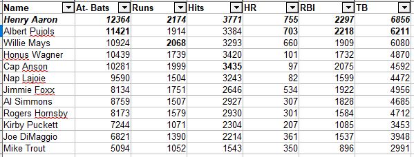 There are six statistical categories in which Henry Aaron is the all-time leader: At-Bats, Runs Scored, Hits, Home Runs, Runs Batted In, and Total Bases. Don’t look now, but Albert Pujols just finished his career ranked #2 in four of those categories.