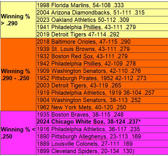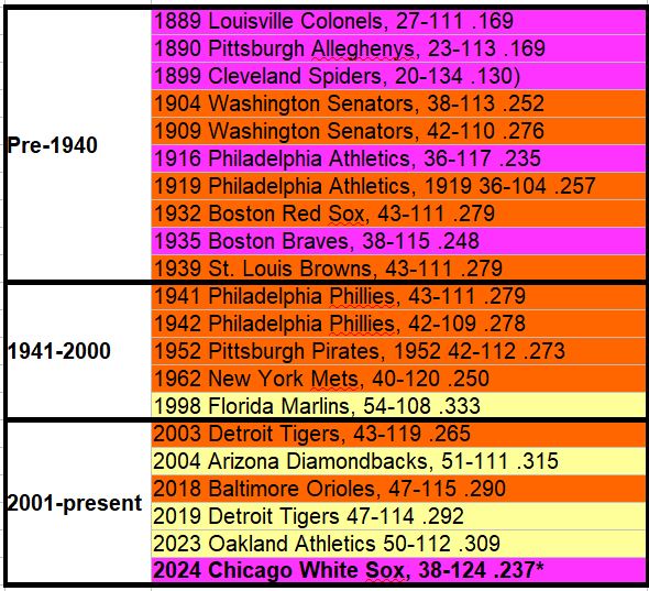 When the 2024 Chicago White Sox are added in place to this list, it’s clear they are amongst the worst of all time. But when one takes those teams and sorts them in ascending order of year, something very important to the “worst ever” argument becomes plainly visible.