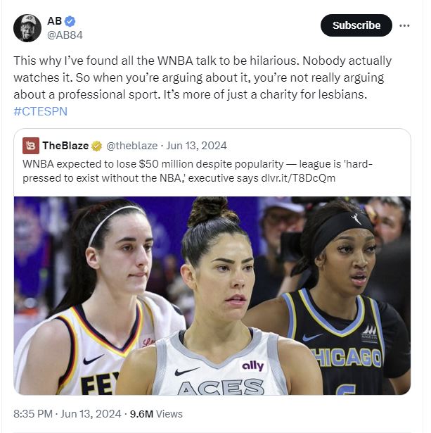 Even a Looney can hit le mot juste. “Charity for Lesbians” should be the WNBA’s mission statement. How else can you illustrate a league that had it’s most-popular year ever and still lost $50 million?