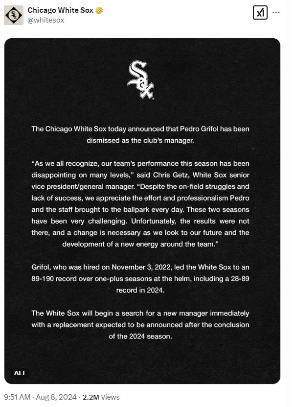 According to the White Sox, Grifol also failed to walk across a lake and heal an injured swan. No wonder they fired his ass.