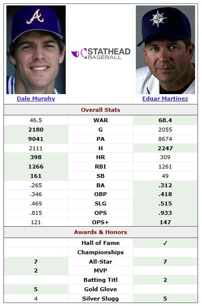 That explains how Frank Thomas was considered a DH for playing 52% of his career games as “bat-only,” as opposed to the 84% for the 500-homer David Ortiz. They knew they really couldn’t put Martinez in ahead of Baines, but that’s exactly what the BBWAA was going to do. So the “Old Timer’s” inducted Baines, but passed over Dale Murphy in the process.
