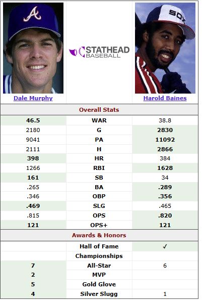 Not only did Dale Murphy have the disadvantage of having played the entirety of his career in the DH-free National League, he broke into the bigs in 1976 as a catcher; easily the most brutal position on the diamond. Baines also didn’t win five Gold Gloves while destroying his knees playing center field in a world containing far too much Astroturf.