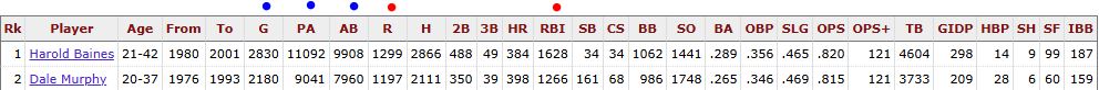 Baines’ numbers are somewhat sexier, but they should be considering he had the advantage of playing nearly 60% of his games not suffering the wear and tear of playing the field. That extended his career by four full seasons over Murphy.
