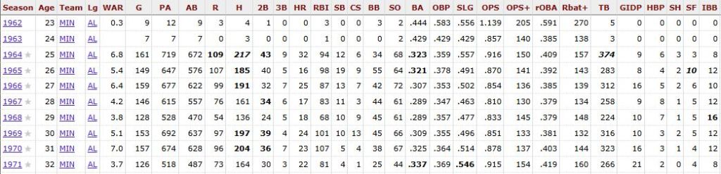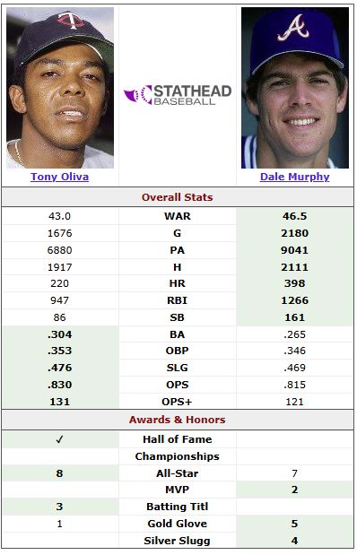 When Oliva and Murphy are compared head-to-head, a similar situation occurs as it does when comparing Harold Baines to Murphy. Baines’ career ends up being ~ 4 seasons (in terms of games played) longer than Murphy’s; the same condition exists between the careers of Murphy and Oliva.