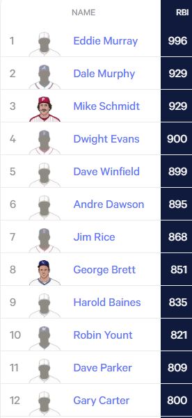 When it comes to driving in runs, it took one of the game’s greatest hitters to outdo Murphy. Eddie Murray is arguably the greatest switch-hitter in baseball history, and the only one among the seven members of the 3,000-hit & 500-home run club. He’s aslo the only player ho drove in more runs in the 1980s than did Dale Murphy.