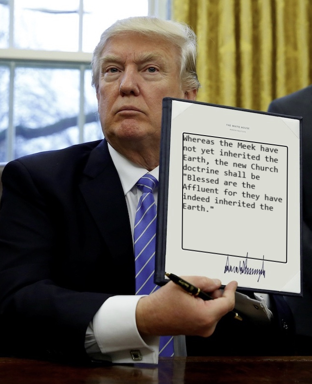 Trump then laid out some specific changes in the Gospels to reflect the move away from the Meek to attract more upscale worshipers.