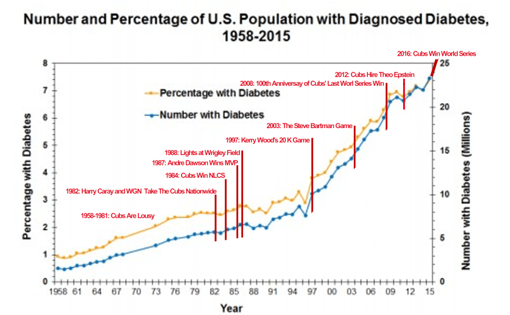 The pivotal moment came in 1982; that’s when the connection becomes visible between the rise in the number of diabetes cases in America compared against a timeline of the significant events in recent Cubs’ history.