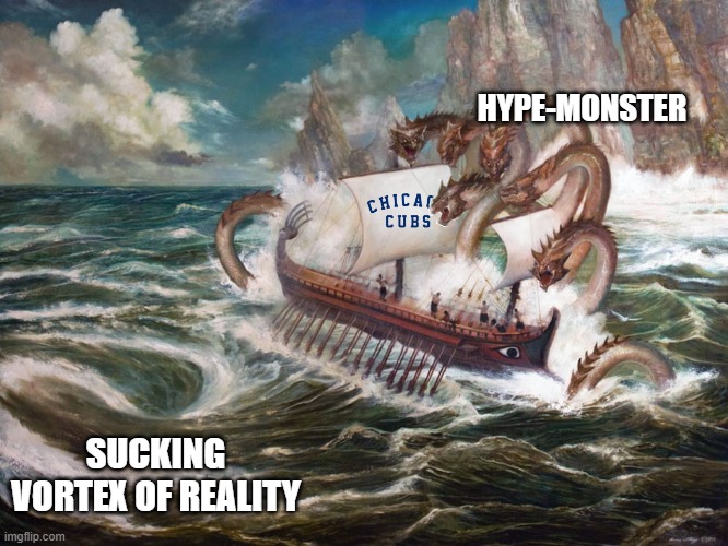 Just go back to that graph and look at the timepoints mentioned. Every one of them involves the corn-syrupy establishment of the Cubs as baseball’s “loveable losers” against the “THIS IS FINALLY THE YEAR!” hype-monster and the sucking vortex of reality. Welcome to the Scylla and Charybdis through which the sugary slop surrounding the Cubs is channeled.