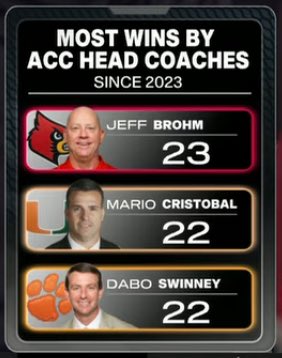 It also may have escaped your consciousness that since coming to Louisville, Coach Brohm is the winningest coach in the Atlantic Coast Conference (ACC). Combined with Brohm’s knock-out power against the big dogs, the fact that scheduling tends to keep our belt rattling around within a conference means it could stay in Louisville for the rest of the season, and certainly within the ACC until a season-ending rivalry showdown with Kentucky.