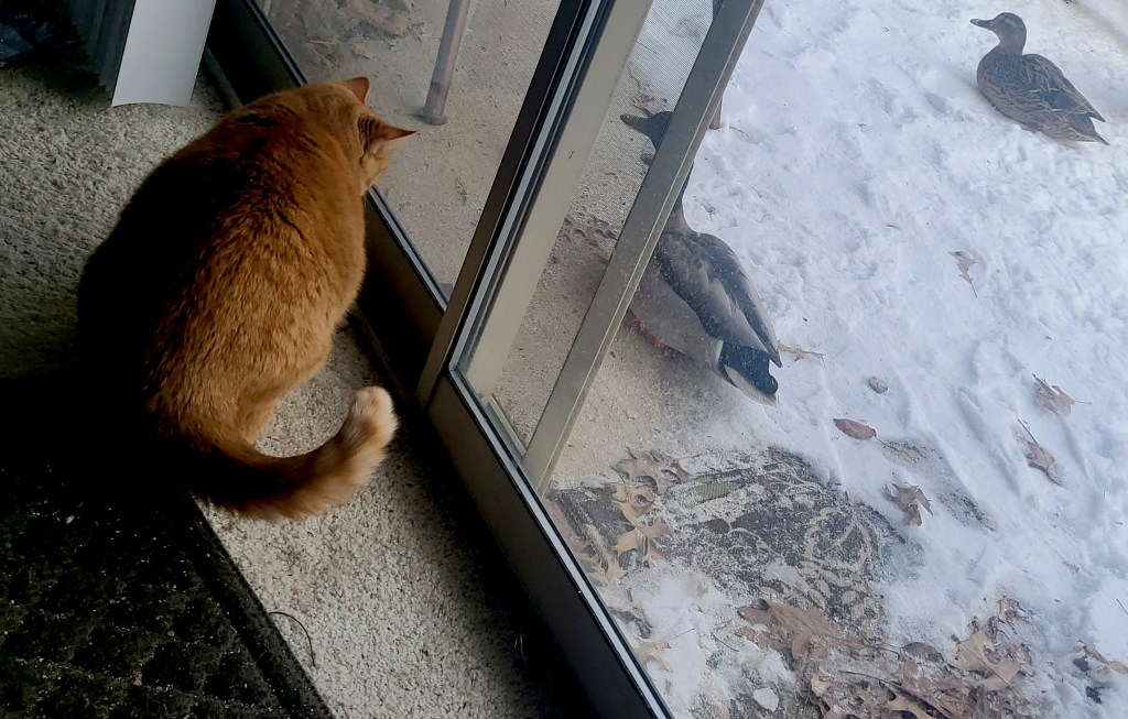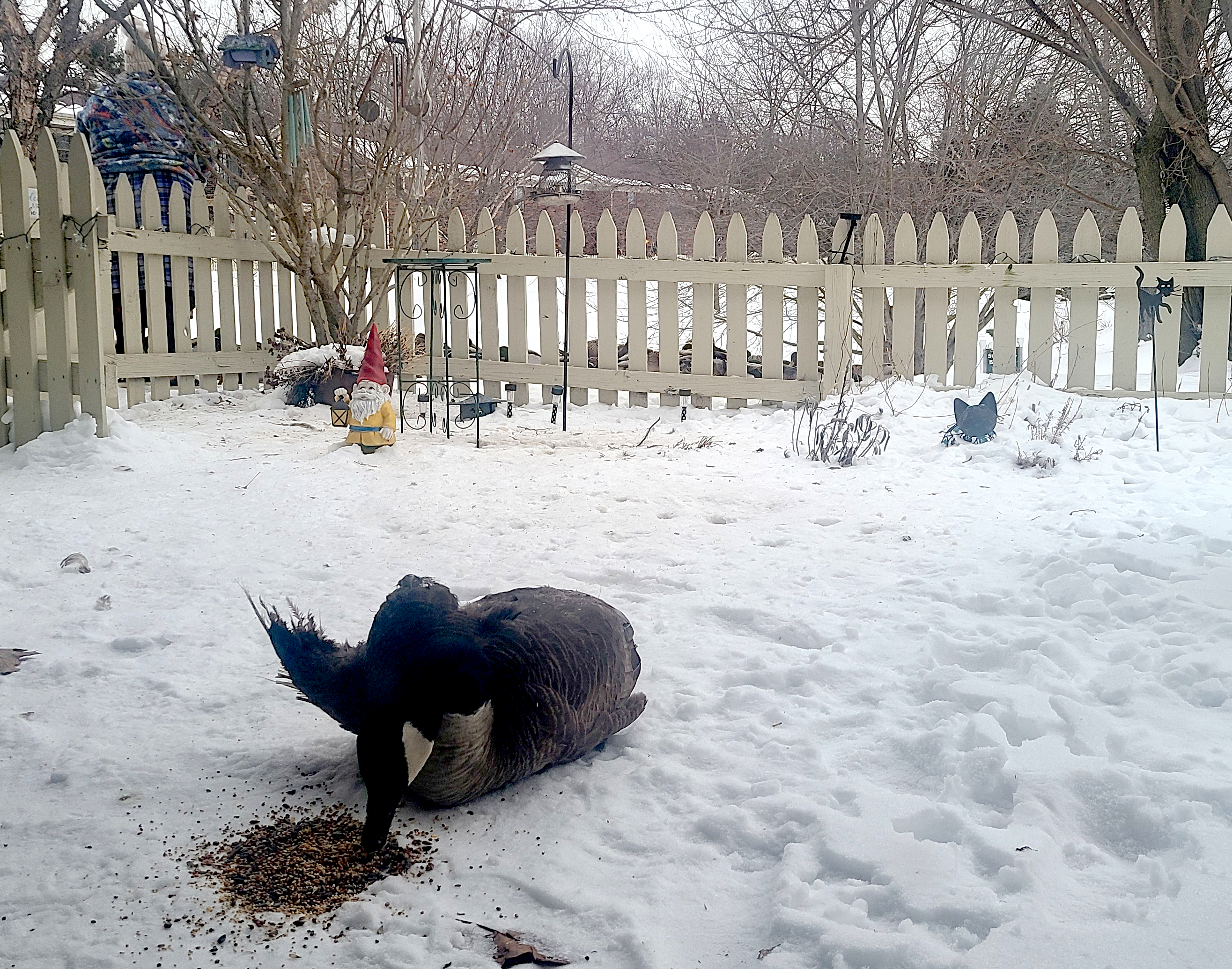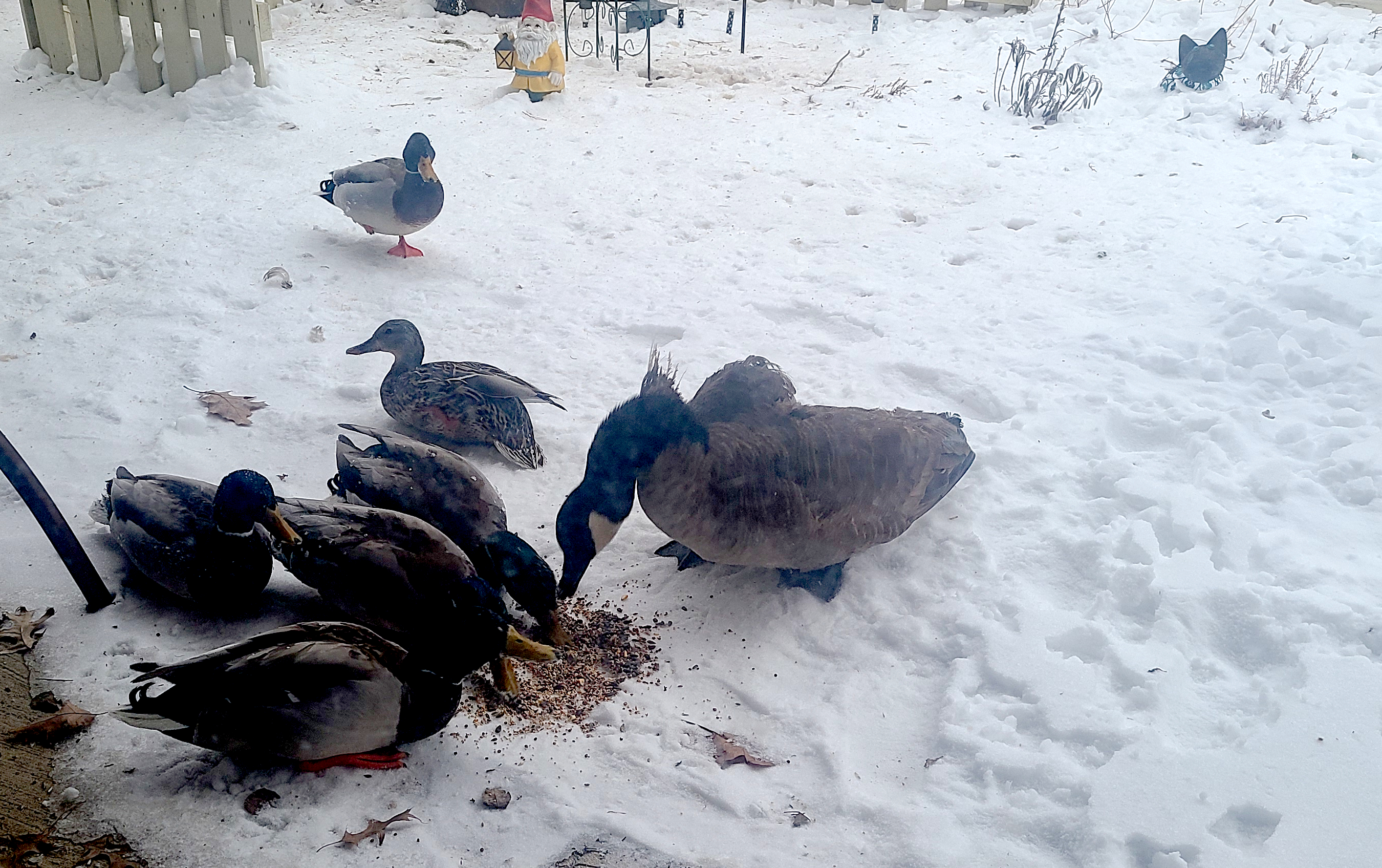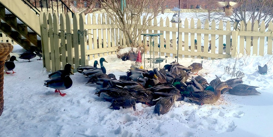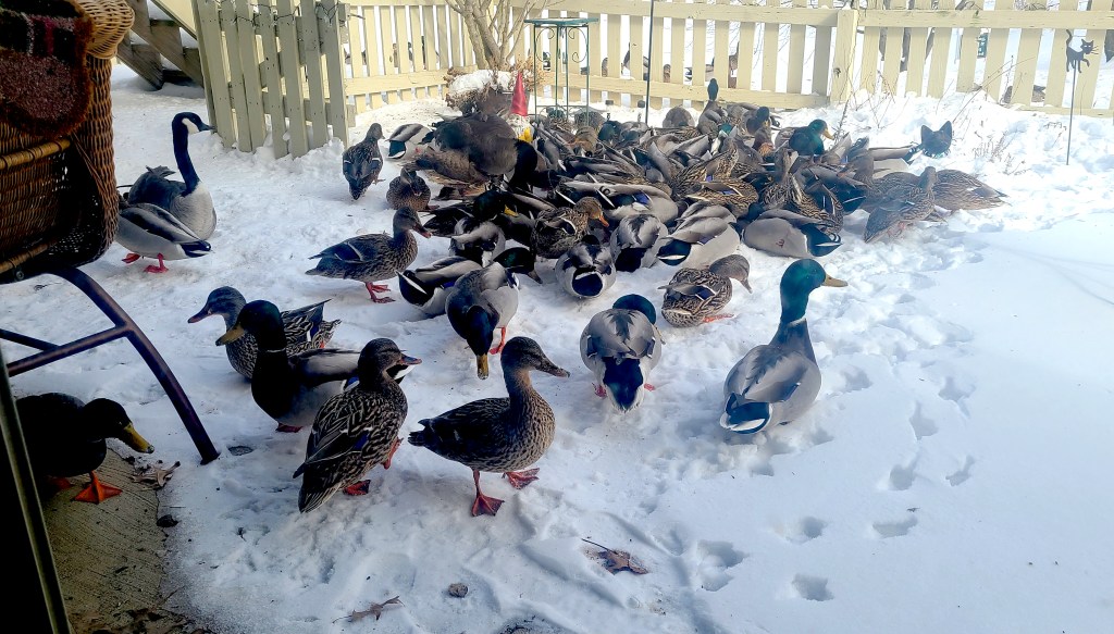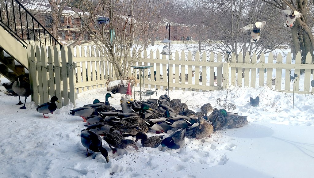 Yesterday is what happens when you live with an animal lover in a place that has wildlife. Granted 95% of said “wildlife” is comprised of ducks and geese who normally would be hanging out on a golf course, except for the fact they found the pond-adjacent backyard now known as “Mrs. J-Dub’s Eco-system.” Despite the garden section lying in it’s winter dormancy, the “air wing” of that eco-system is still quite active. All the evidence one would need waddles in every afternoon for “refueling.”