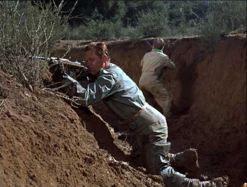 Brubaker escapes his crippled F9F Panther to take cover in a ditch. Forney and Gamidge’s rescue helicopter soon appears on the horizon, but a North Korean patrol also enters the area. As Gamidge begins his rescue attempt, a burst of machine gun fire kills him instantly and disables the chopper. Forney is forced to join Brubaker in his defensive position, hoping they can hold off the North Koreans long enough for another rescue attempt. But armed only with pistols, two M1 carbines, and limited amount of ammunition, they are eventually cut down by the North Koreans.