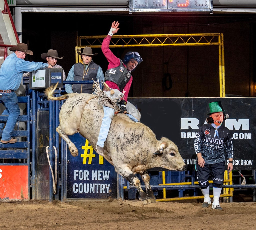 Then there’s the rescue crews. In rodeo, this role falls to the bullfighters…or the artists formerly known as “rodeo clowns.” Back in the day, their clown-like costumes were believed to help draw the bull’s attention away from a downed rider, allowing him to escape. Sometimes, they have to rescue a rider who can’t escape.