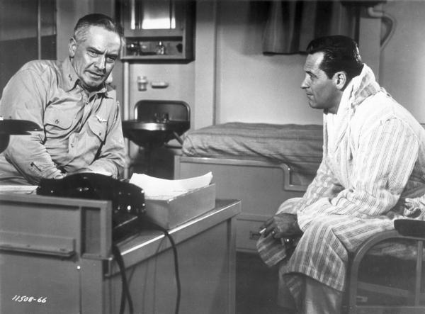 Once back aboard the USS Savo Island, Brubaker is called to the quarters of Rear Admiral Tarrant (played by Fredric March). Tarrant lost his own son at the Battle of Midway in 1942 and Brubaker reminds Tarrant of him.